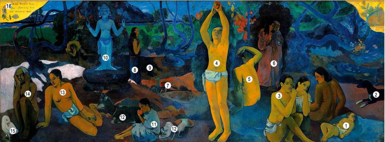 Самый известный шедевр Поля Гогена и одна из популярнейших картин постимпрессионизма, состоит из трех основных групп, иллюстрирующих вопросы, поставленные в названии. По словам художника, работу стоит изучать справа-налево. Считается, что отчаяние, вызванное смертью дочери в начале 1897, побудило живописца, после завершение картины, совершить попытку самоубийства (неудачную). Гоген считал эту работу своей лучшей картиной и грандиозной кульминацией своих мыслей.