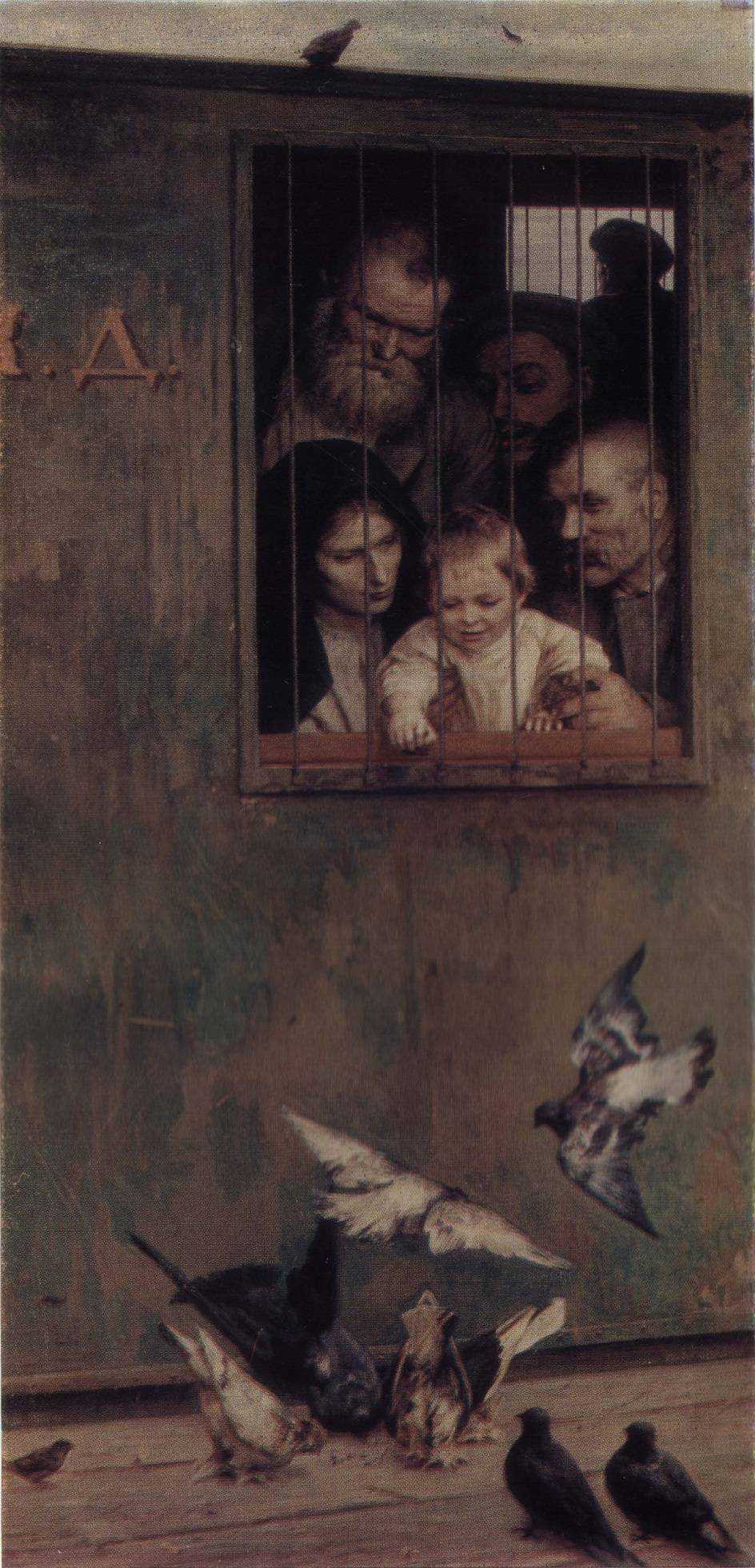 - «Всюду жизнь» (1888) — оригинальное композиционное решение, случайный выхваченный эпизод: зарешеченное окно железнодорожного вагона, голуби на потертом дощатом перроне. Ребенок радуется птицам. Это делает картину живой, понятной народу.