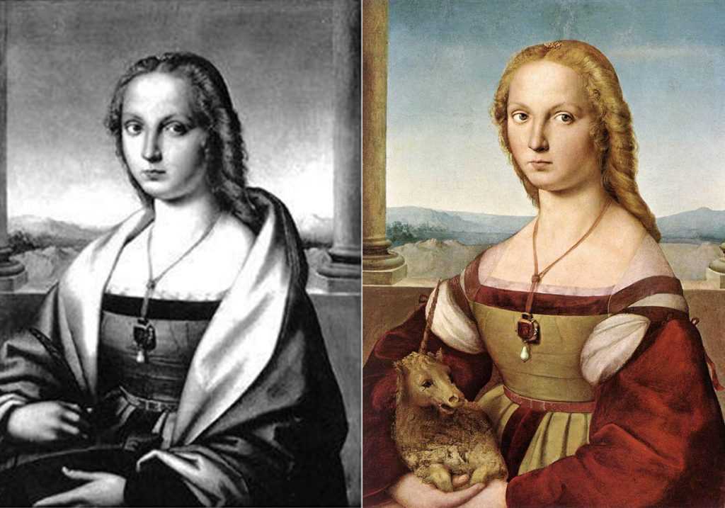 Если бы историям реставрации картин давали заголовки, то «Даму с единорогом» назвали бы «А был ли единорожек?». Написанная в начале XVI века, полотно Рафаэля изображало некую даму, но впервые оно упоминается под названием «Святая Екатерина Александрийская». К 1959 году состояние картины было плачевным, и ее решили отреставрировать. Тогда и выяснилось, что неизвестную даму по какой-то причине превратили в Святую Екатерину, дорисовав ей главные атрибуты святой: мученическое колесо (символ Божьей избранницы) и пальмовую ветвь. Чтобы образ выглядел более целомудренно, даме даже прикрыли голые плечи, заботливо пририсовав накидку.