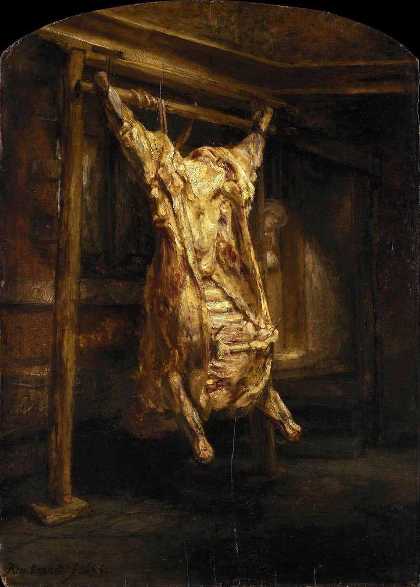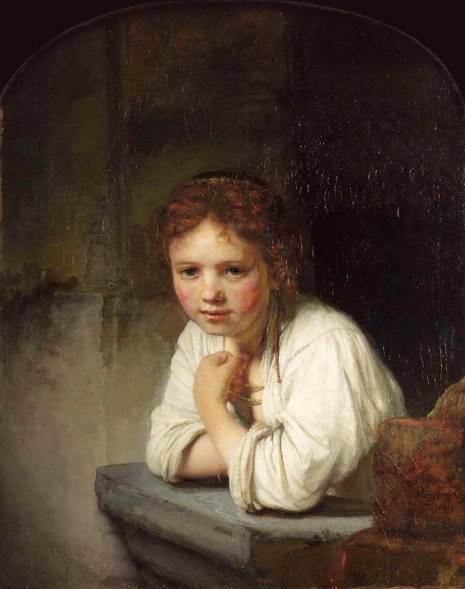 Рембрандт, при всей своей привязанности к современности, избегал социальных анекдотов в живописи, столь популярных в тогдашней среде. Правда, некоторые его работы принято называть жанровыми, но на самом деле они или являются гибридом, располагаясь на границах жанров, или вообще не идентифицируются в социальном плане. Например, в начале своего творческого пути Рембрандт довольно часто писал головы — в основном стариков. Эти рисунки одновременно и портреты, и жанровые этюды. В зрелые годы художник написал серию портретов молодых девушек и женщин. Они одеты как служанки и часто держат в руках щетку или выглядывают из окна, как эта «Девушка, облокотившаяся на подоконник», 1645 год. Натюрморты Рембрандта можно пересчитать по пальцам, но среди них есть два общепризнанных шедевра — на них изображена туша быка «Освежеванный бык».