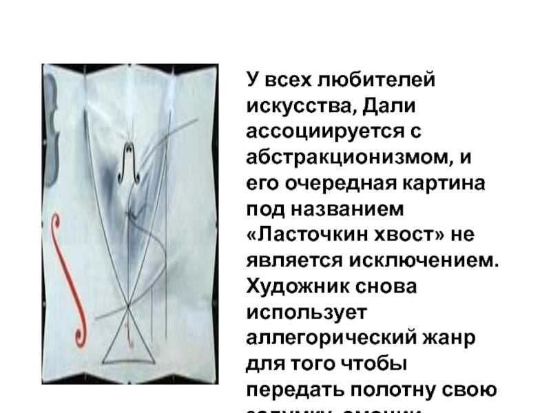 У всех любителей искусства, Дали ассоциируется с абстракционизмом, и его очередная картина под названием «Ласточкин хвост» не является исключением. Художник снова использует аллегорический жанр для того чтобы передать полотну свою задумку, эмоции и чувства.