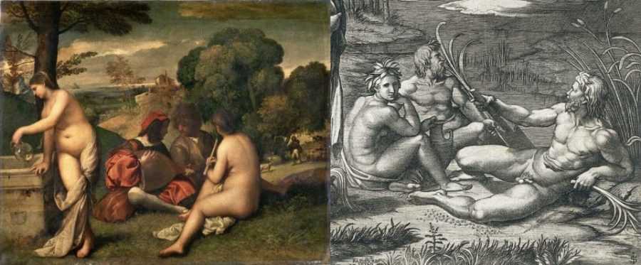 Слева: Джорджоне. Сельский концерт. 1506-1512 гг. Лувр, Париж. Справа: Маркантонио Раймонди. Гравюра “Суд Париса”. 1513-1515 гг. Музей Метрополитен, Нью-Йорк