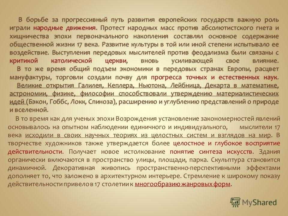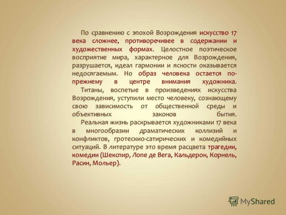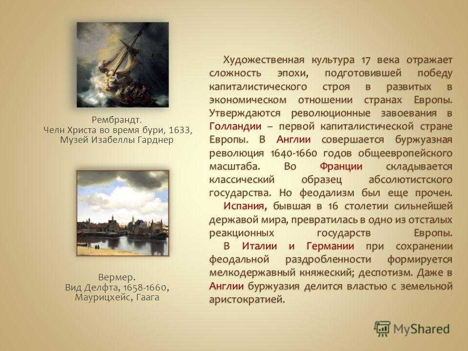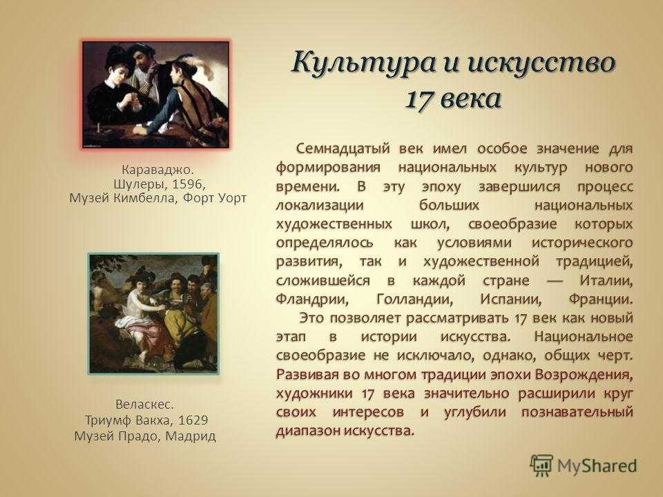 17 веку принадлежат величайшие мастера реализма Караваджо, Веласкес, Рембрандт, Хальс, Вермер Дельфтский. В 17 столетии на первое место выступают те национальные школы, в искусстве которых были достигнуты высшие творческие результаты. Италия, Испания, Фландрия, Голландия, Франция быстро становятся влиятельными художественными центрами. В других европейских странах Англии, Германии, Австрии, Чехии, Польше, Дании художественная культура сохраняет отпечаток локальных свойств и взаимосвязи с традицией предшествующих эпох.