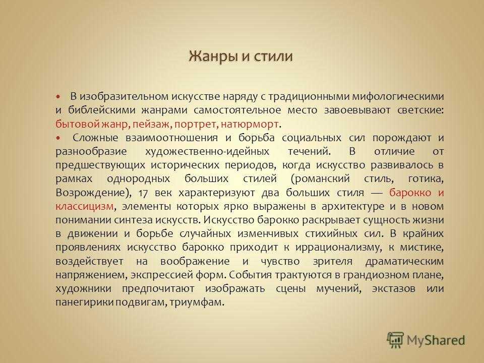 В изобразительном искусстве наряду с традиционными мифологическими и библейскими жанрами самостоятельное место завоевывают светские: бытовой жанр, пейзаж, портрет, натюрморт. Сложные взаимоотношения и борьба социальных сил порождают и разнообразие художественно-идейных течений. В отличие от предшествующих исторических периодов, когда искусство развивалось в рамках однородных больших стилей (романский стиль, готика, Возрождение), 17 век характеризуют два больших стиля барокко и классицизм, элементы которых ярко выражены в архитектуре и в новом понимании синтеза искусств. Искусство барокко раскрывает сущность жизни в движении и борьбе случайных изменчивых стихийных сил. В крайних проявлениях искусство барокко приходит к иррационализму, к мистике, воздействует на воображение и чувство зрителя драматическим напряжением, экспрессией форм. События трактуются в грандиозном плане, художники предпочитают изображать сцены мучений, экстазов или панегирики подвигам, триумфам.