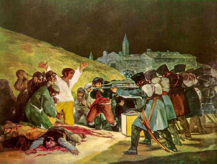 2 мая 1808 года жители Мадрида восстали против оккупации города французской армией Наполеона. Гойя запечатлел это восстание в своей картине «Второе мая 1808 года». «Третье мая 1808 года» самая известная картина художника, изображает возмездие французов на следующий день, во время которого были схвачены и расстреляны сотни испанцев. Картина не имеет явных прецедентов, поскольку расходится с традиционными изображениями войны. Таким образом считается одной из первых картин современной эпохи. Известный британский историк искусства Кеннет Кларк описал шедевр Гойи как «Первая великая картина, которую можно назвать революционной во всех смыслах этого слова, по стилю, по сюжету и по замыслу». Третье мая послужило вдохновением для создания нескольких известных картин будущих художников, в первую очередь шедевра Пабло Пикассо «Герника».