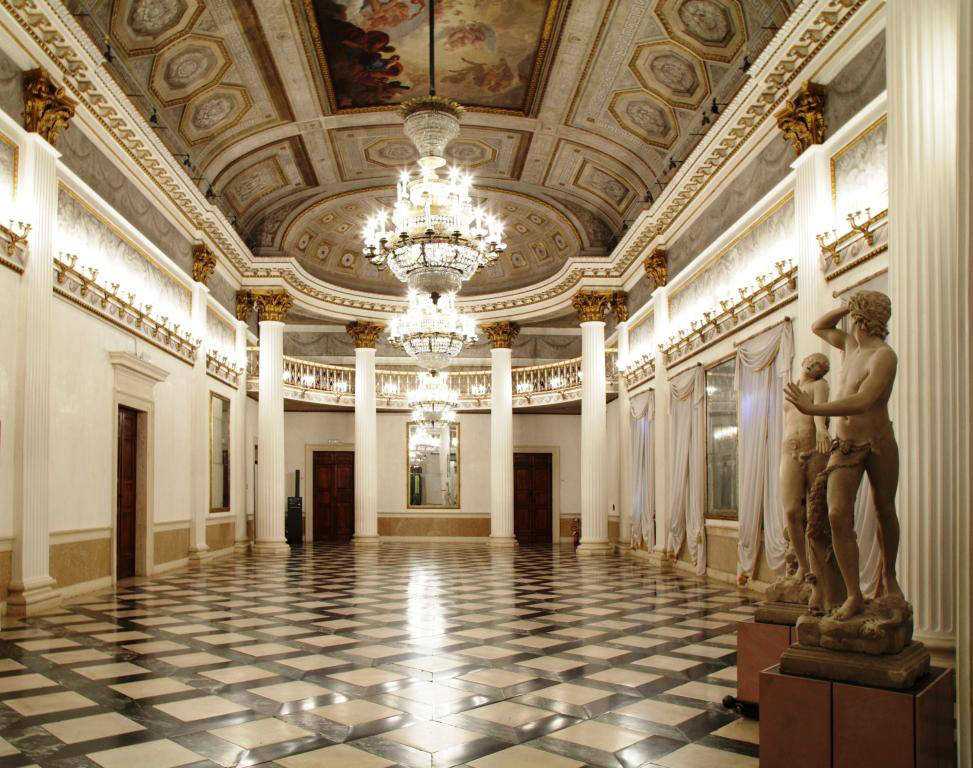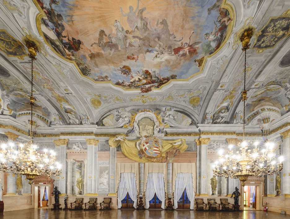 Второй пролет Золотой лестницы ведет к Залу Четырех Дверей, потолок которого спроектировал Палладио и расписал Тинторетто.