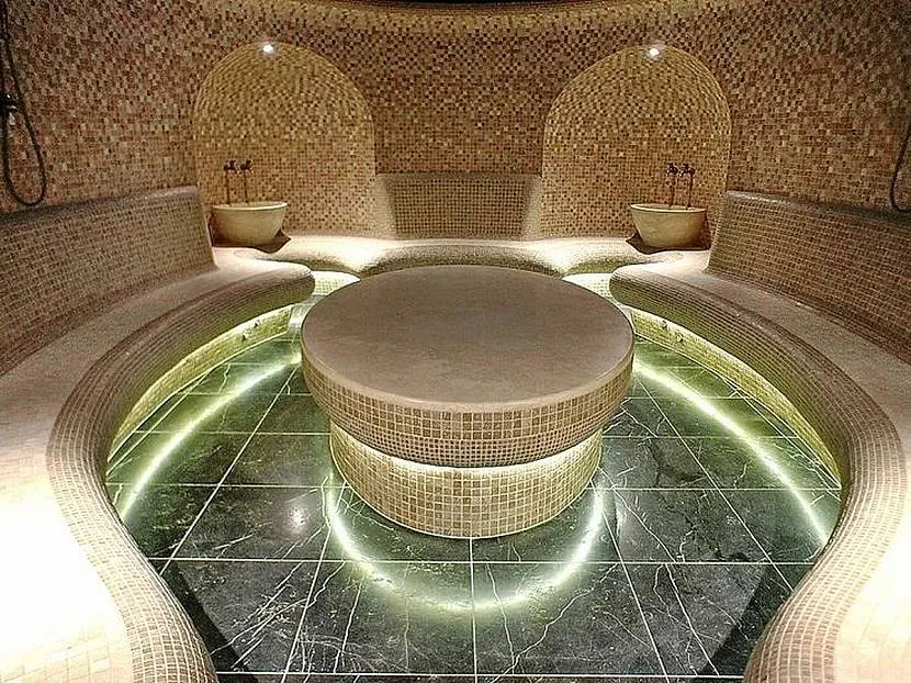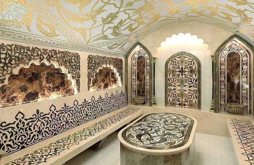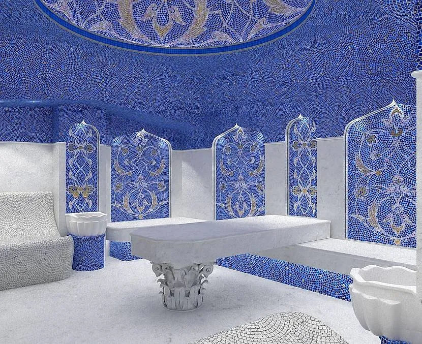 Стены хамама украшают турецкими орнаментами. В дизайне гармонично сочетают растительные и животные мотивы, собранные в единую композицию. Элементом декора парной станут традиционные курны из мрамора или оникса.