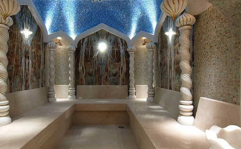 Дизайн хамама напоминает дворец, но без нарочитой торжественности. Традиционная отделка турецкой бани – мрамор. Поверхности можно облицевать плиткой или мозаикой из натуральных камней (травертина, оникса). Восточные узоры встречаются на скамейках, колоннах и фонтанах.