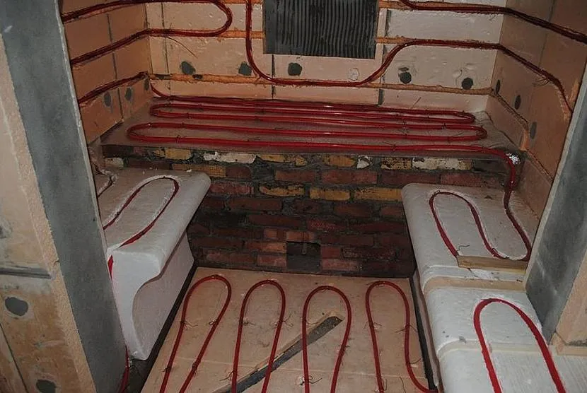В хамаме часто сооружают бетонную лавку. Чтобы лежанка выдерживала большой вес, на стадии создания армируют металлической сеткой. На пол кладут электрические маты, сверху заливают стяжкой. Система подогрева создаст в помещении приятное, расслабляющее тепло.
