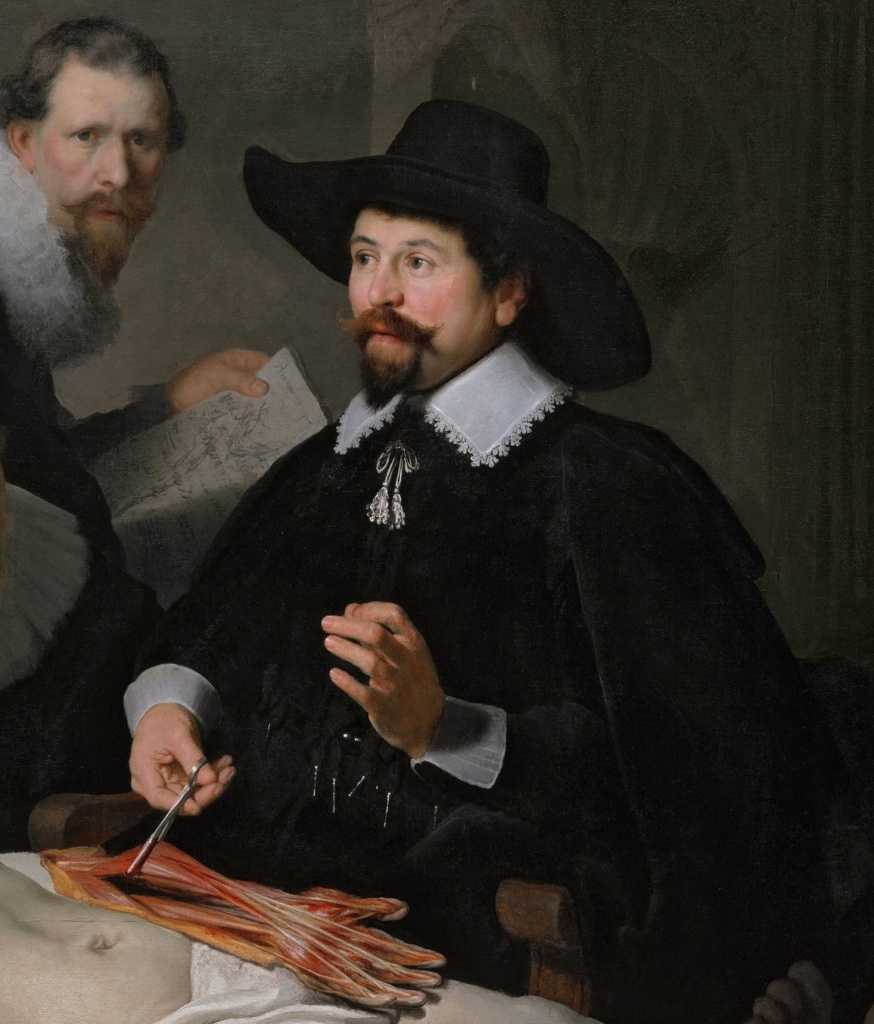 Центральная фигура картины — доктор Николас Тульп, который указывает собравшимся устройство мускулатуры руки человека.