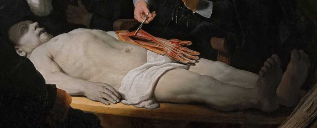 Живописцы до Рембрандта обычно изображали лицо покойного прикрытым платком либо стоящим перед ним человеком. Наблюдатели должны были запамятовать о том, что перед ними находится человек, которого расчленяют на их очах. Рембрандт вымыслил промежуточное решение — он изобразил его лицо, наполовину покрытое тенью. Обычная для Рембрандта игра на контрасте света и тени, будто бы в полумраке видна umbra mortis — тень погибели.
