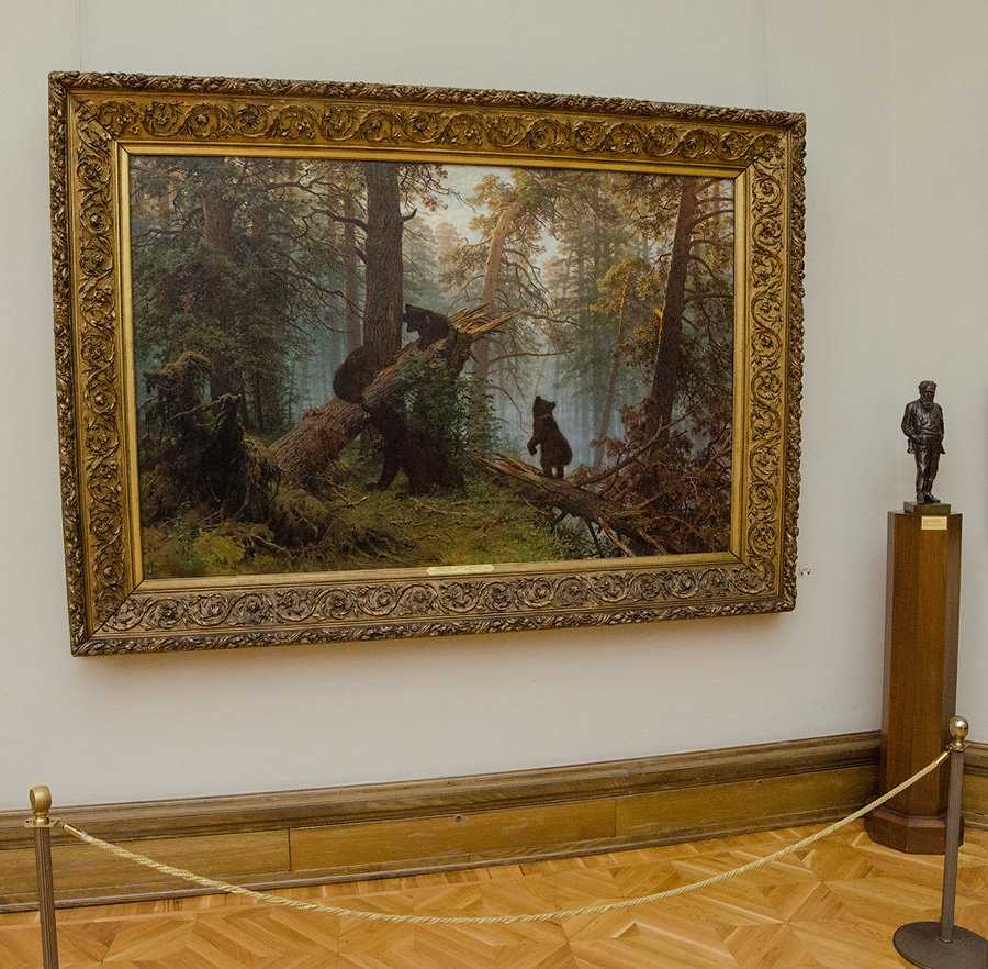 Правомерно ли считать автором картины именно Шишкина? Пожалуй, да, поскольку эта работа безусловно создана в стилистике Шишкина, это его подробный, хоть ботанику по картине изучай, лес, его густой туман, это безусловно его живописный метод. Однако нельзя отрицать, что прелестные медведица с медвежатами Константина Савицкого отлично вписались в шишкинский сосновый лес и придали ему особый шарм. Туманный рассвет в лесу, окутанные утренней розоватой дымкой уходящие в небо сосны, ощущение абсолютной окружающей тишины – иначе мишки бы так привольно не резвились. В итоге перед нами великолепный результат соавторства двух художников. Соглашаясь с тем, что картина по всем критериям «шишкинская», мы предлагаем помнить и о роли Савицкого в создании этой работы, тем более, сам Иван Шишкин ее признавал.