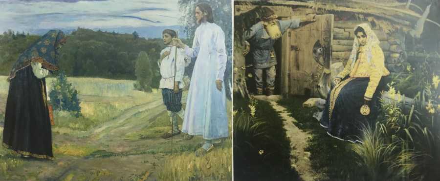 Картина Михаила Нестерова. Слева: Поклон путнику. 1921. Тверская картинная галерея. Справа: За приворотным зельем. 1888. Радищевский музей в Саратове. Фото из книги С.В. Игнатенко “Нестеров”. Изд. “Diton”, 2012.