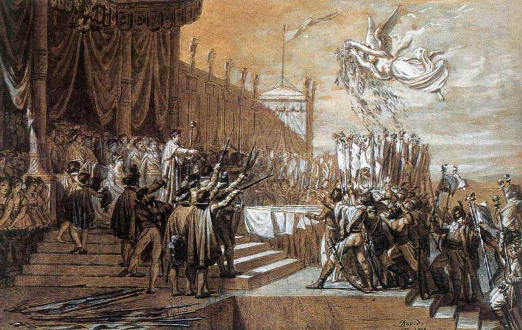 В 1784 г. Давид написал картину Клятва Горациев, представленную на Салоне 1785 г. Во время революции художник принимал активное участие в общественно-политической жизни; в 1790 г. якобинцы попросили его написать еще одну картину на тему принесения клятвы (Клятва Паллакорды, Версаль), но это произведение так никогда и не было закончено.