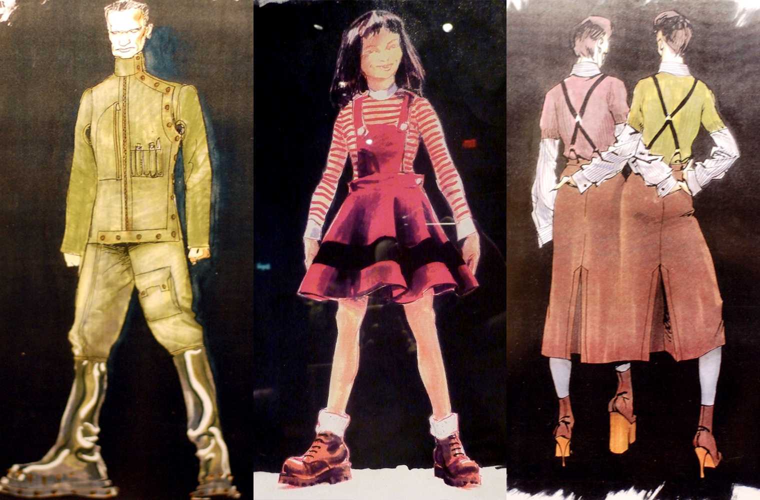 Благодаря тому, что сюжет не привязан к какому-либо времени и месту, Жан-Поль Готье смог соединить в одежде героев ретро-эстетику и научно-фантастические детали. Строгие лабораторные халаты злодея-ученого Кранка и клонированных братьев выполнены в минималистичном фисташковом оттенке, а пальто, которое он иногда надевает поверх, наоборот, пышно расшито цветочными узорами. На форме каждого из шести клонов присутствуют медные пуговицы и нашивки, помогающие определить их деятельность и отличить повара от механика. Парчовый жилет шарманщика Марчелло украшен пуговицами в виде золотых блох — именно их бывший циркач дрессирует и подковывает ядом. Колоритных старух-сиамских близнецов Готье наряжает в свои фирменные твидовые пиджаки и юбки. А костюм маленькой девочки Миетт, которая является предводительницей местной детской шайки, отсылает еще к одной характерной черте стиля французского дизайнера — бритонской полоске, здесь выполненной не в традиционную синюю, а красную полосу. Яркость одежды (в том числе уютного зеленого свитера силача Уана и красного сарафана Миетт) выделяет героев на фоне мрачного города, придавая истории еще большую сказочность.