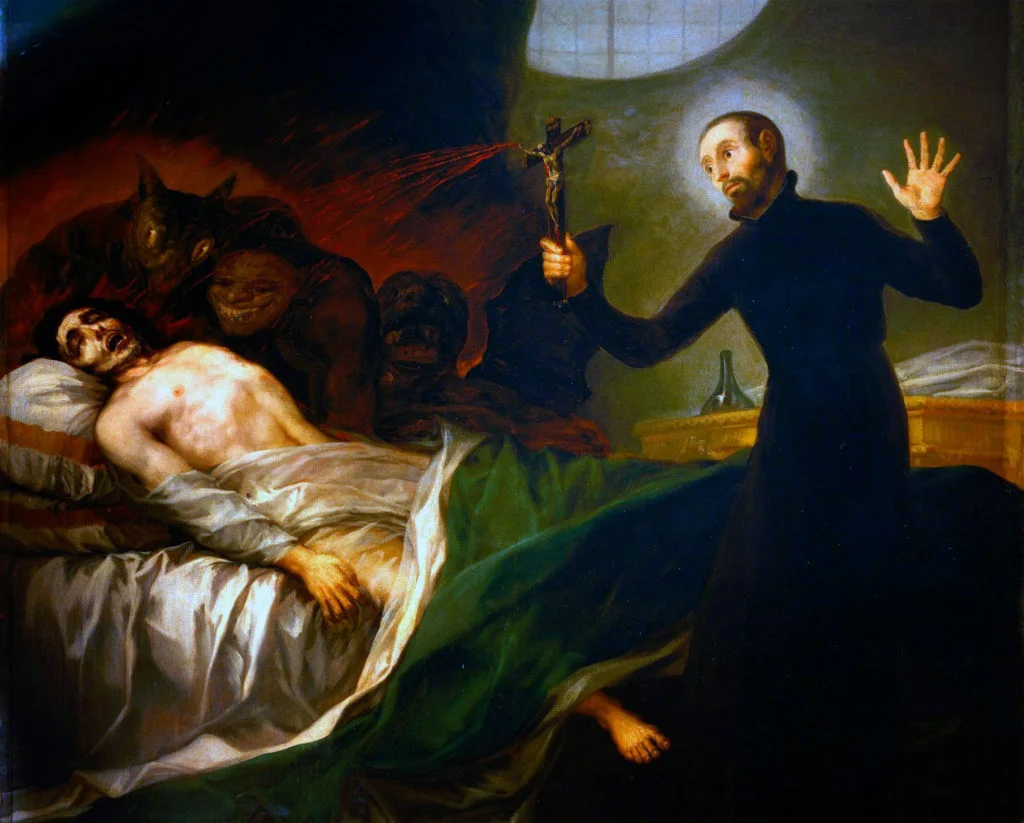 Тема страданий и смерти становится основной в работах великого художника. Так, на картине «Святой Франциск Борджиа у гроба умирающего грешника» перед нами предстает умирающий человек и демоны, кровожадно ждущие его кончины. Напротив него изображен святой Франциск Борджиа с распятием в руках, из которого на умирающего падают струи крови. Именно это чудо должно помощь человеку не попасть в ад и спастись.
